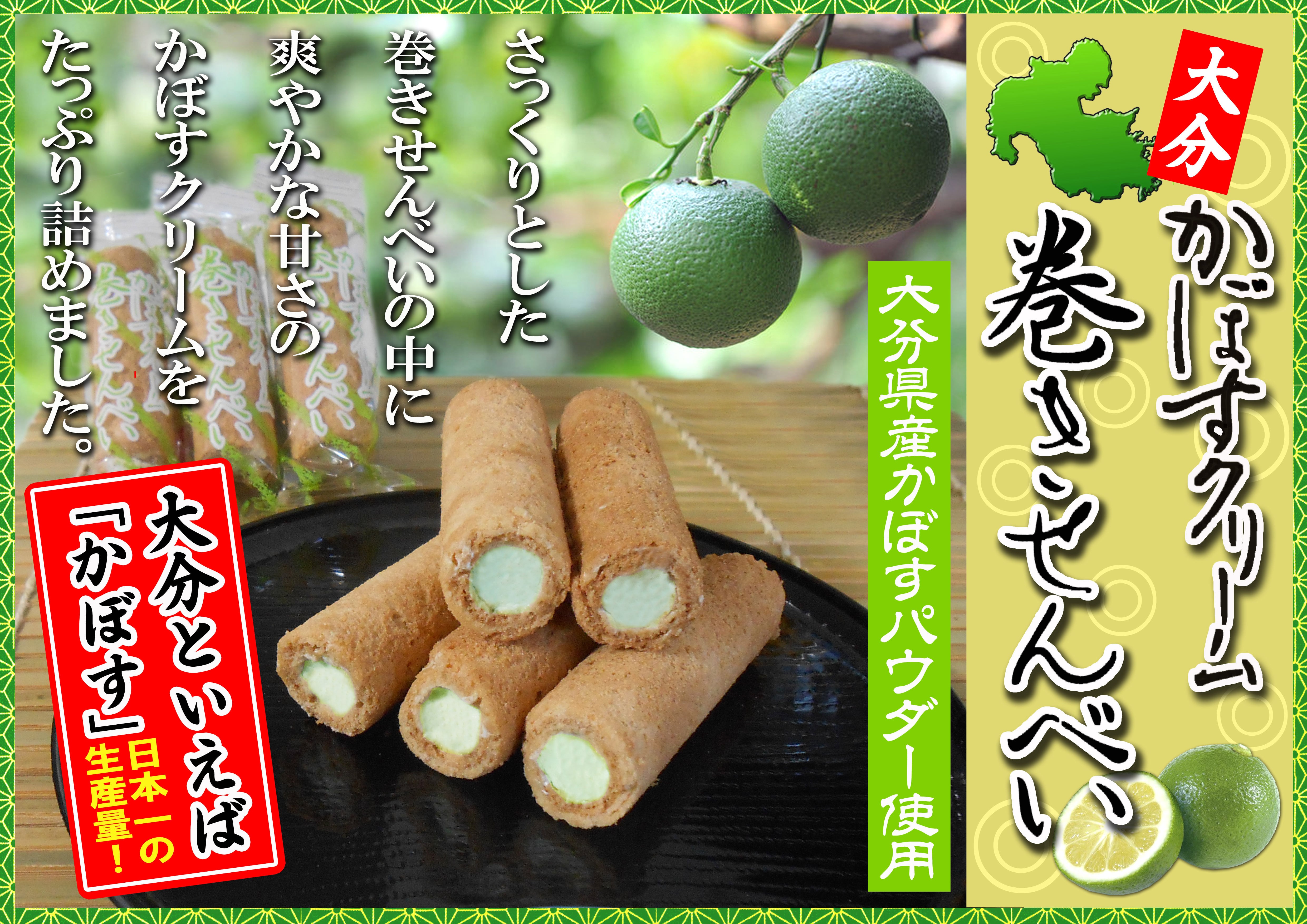 大分県産のかぼすの粉末をクリームに使用した巻きせんべいです。