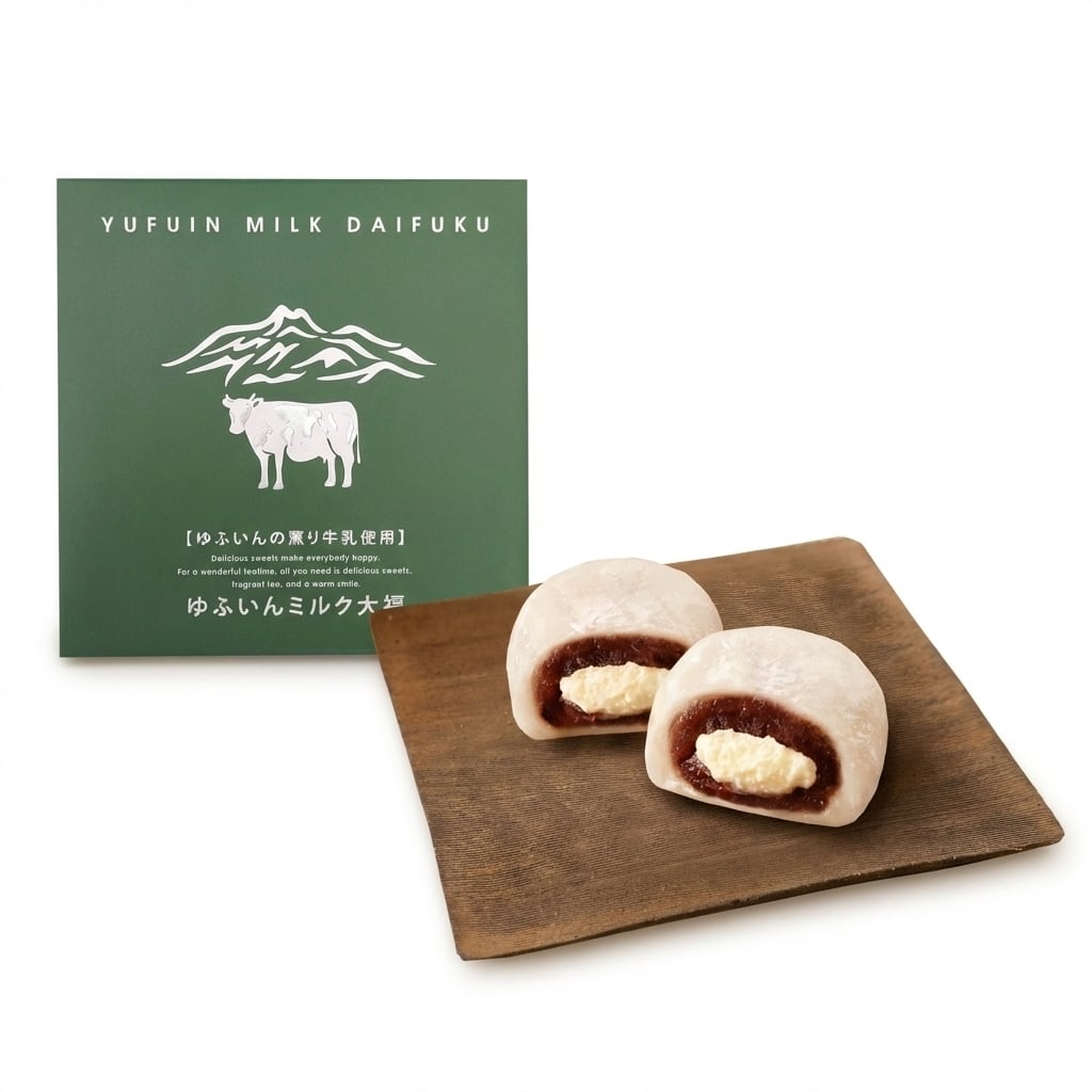 ゆふいんミルク大福は、贅沢なゆふいん産牛乳を使用したミルク大福です。ふんわりとしたお餅の中にたっぷりと濃厚なクリームとこし餡を詰め込み、一口噛むと口の中に広がる風味はまさに絶品。お餅のやさしい甘さが絶妙なバランス。